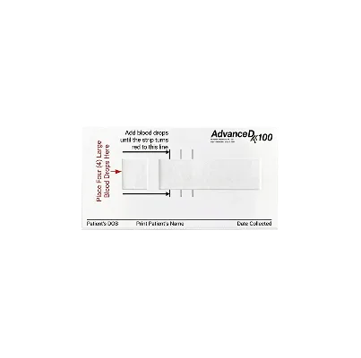 Wipe away the first drop of blood with a gauze pad. Add 4–7 large drops to the left square of the card (top-left if there are two strips), or enough blood to pass the first line. Samples that do not pass the line cannot be analyzed. If needed, use a new finger and lancet. Do not add blood after the sample has dried, as this will invalidate the test.